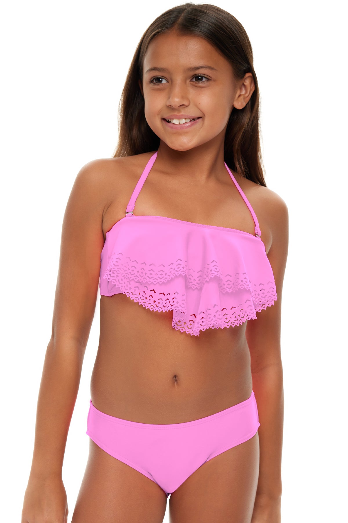 Double layer flutter top with detailed front and removable straps. Comes with G061 – Girls Classic Bottom, a classic fit medium-rise bottom.